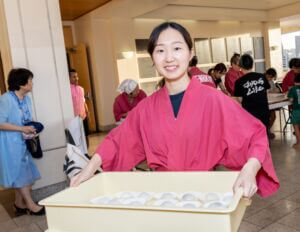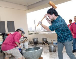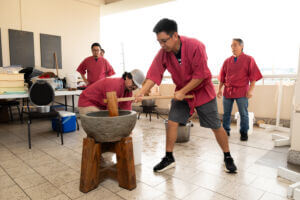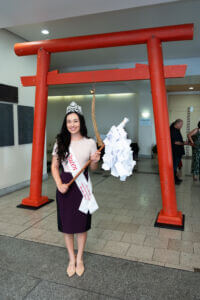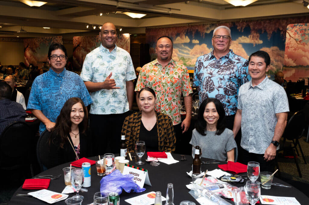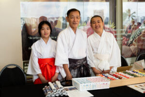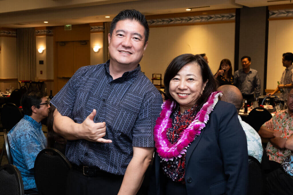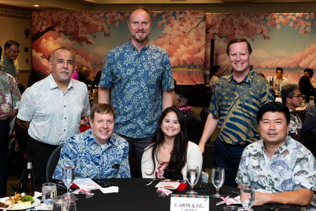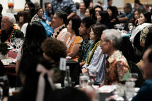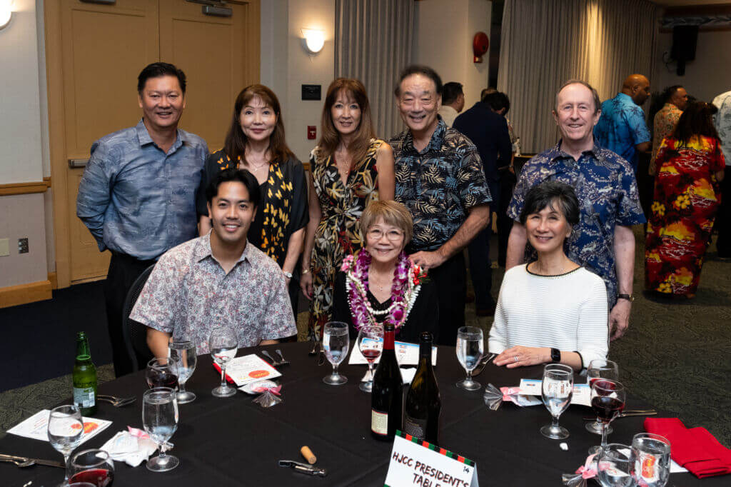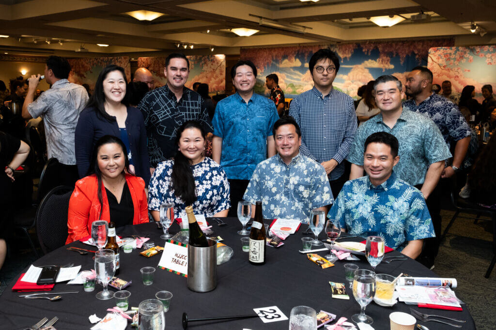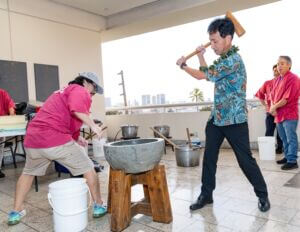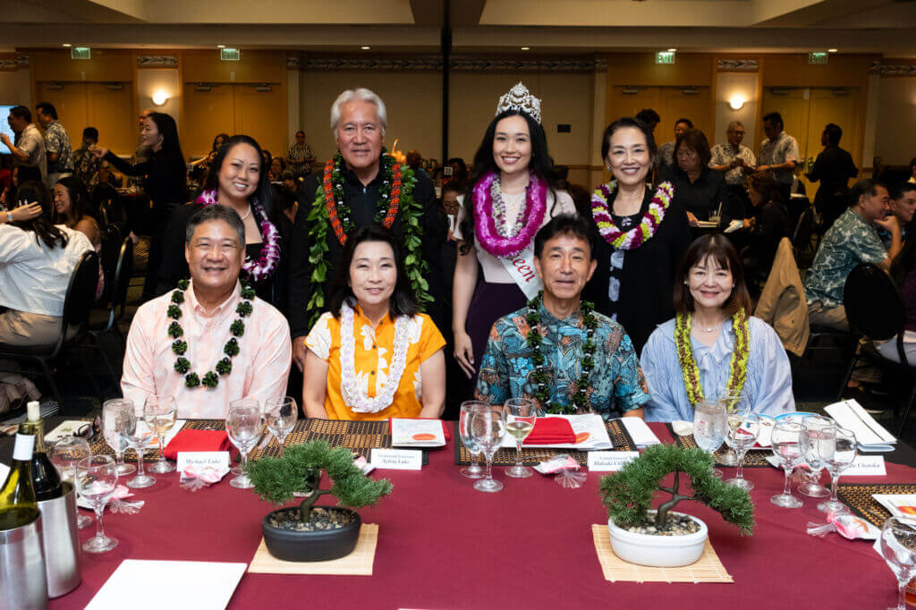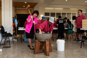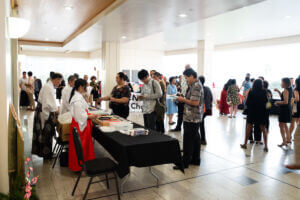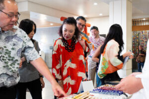 As guests arrived, the foyer was bustling with excitement and activity. As attendees hopped off the elevator, they were greeted and blessed by the reigning 73rd Cherry Blossom Festival Queen Ariel Sanders and HJCC President & CEO Steven Teruya under the Chamber's Torii Gate. Attendees had the opportunity to enjoy a variety of cultural experiences before the program began, including a wonderful mochi pounding demonstration by the volunteers from Tenrikyo Mission Hawaii, which brought energy and tradition to the start of the evening.